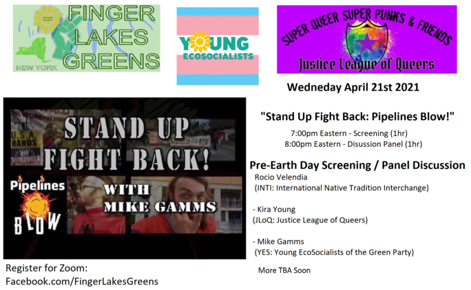 The Finger Lakes Greens and Young EcoSocialists of the GPUS present the movie "Stand Up Fight Back: Pipelines Blow!" followed by a Panel Discussion. "Stand Up Fight Back: Pipelines Blow!" "Pipelines Blow!" is a comedy / documentary covering pipeline fights all over the US for the past 3 years from the Dakota Access Pipeline in North Dakota to the LA Comedy Store Roast Battle to The Mountaineer Gas / Potomac Pipeline in West Virginia. Featuring SuperActivist Kira Young. Also covering the Atlantic Coast and Mountain Valley Pipelines in Virginia, Line 3 in Minnesota, Mariner East in Pennsylvania, Williams pipeline in New Jersey.