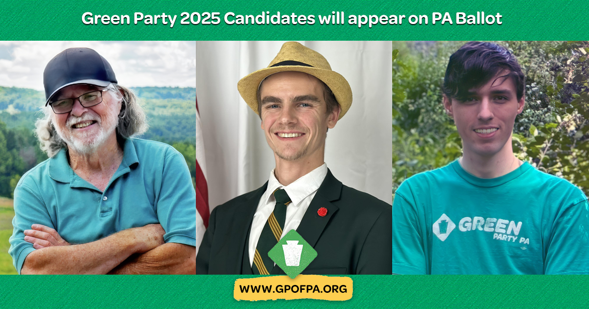 On August 11, three Green Party's candidates were accepted on the 2025 General Election ballot by the Pennsylvania Department of State. The nomination of one Green Party candidate has been challenged.