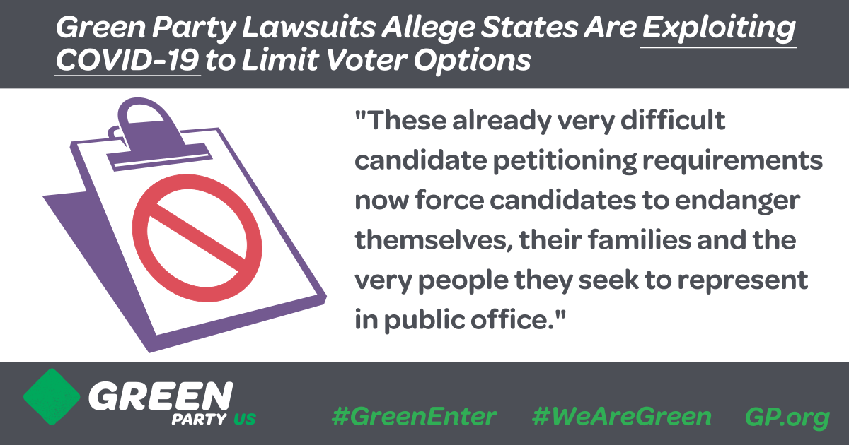 The Green Party of the United States has announced lawsuits have been filed in Illinois and Georgia to stop Democratic- and Republican-run boards of elections from exploiting COVID-19, social distancing and shelter-in-place guidelines that prevent the Green Party from gathering petition signatures for candidates. The Green Party has been appealing to governors across the nation for emergency ballot access relief for candidates in the interest of public health and safety. Lawsuits in more states are being explored if officials do not respond.