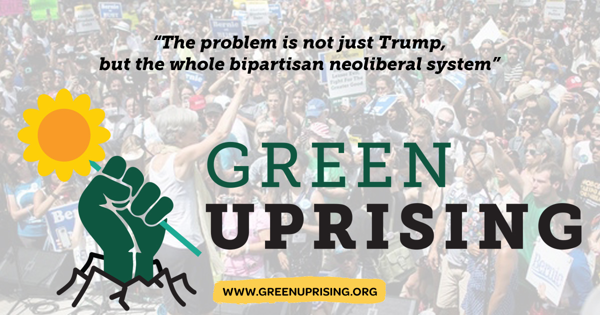 Tonight we introduce Green Uprising, a new home base for peaceful revolution where we turn resistance from the last election into rebellion in the next. Green Uprising resists not just Trump, but the whole bipartisan corporate system spreading war and injustice across the globe, paving the way for demagogues like Trump. We’ll discuss the continuing corporate control of the Democratic Party by Wall Street and war profiteers, and the illusion of a progressive insurgency in the primaries when in reality the establishment overwhelmingly prevailed. We’ll also talk about amazing Green candidates in winnable races promoting an agenda for people, planet and peace over profit.