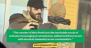 The Green Party of Michigan condemns the murder of Alex Pretti by federal agents in Minneapolis. This was the inevitable result of actively encouraging an unwelcome, militarized force to act with absolute immunity in our communities.