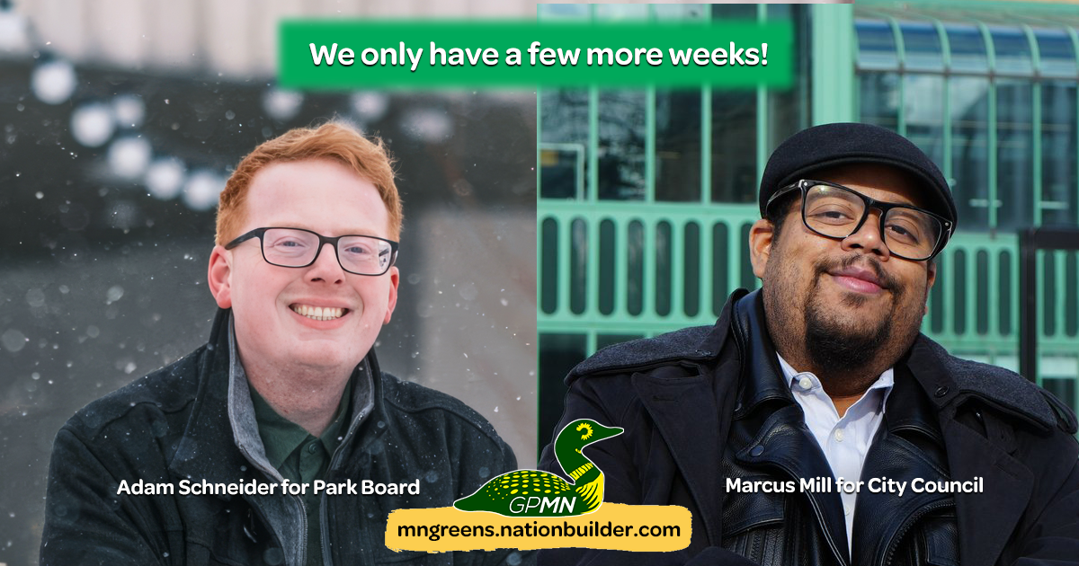 We have less than one month until Election Day in Minneapolis, and our candidates have been hitting the campaign trail hard. Marcus Mills for City Council and Adam Schneider for Park Board, and their grassroots campaigns have been challenging the city's corporate status quo machine while reaching out to thousands of Minneapolis residents.