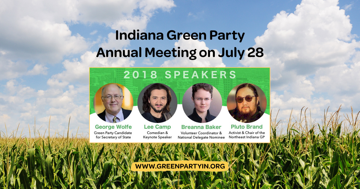 Hoosier Greens from around the state will rally together at Grove Haus in Indianapolis on July 28th. Come and meet fellow Greens, help us shape our platform, nominate and elect new officers and delegates, and enjoy some great speakers.
