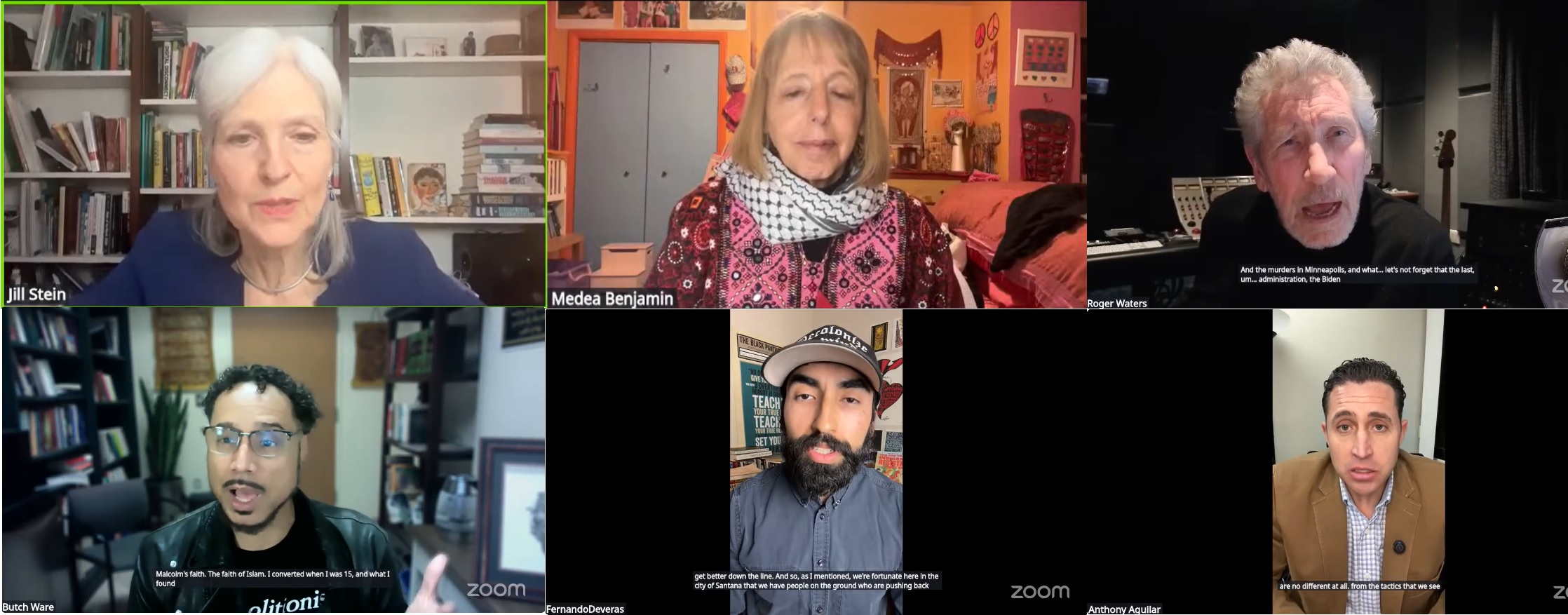 Panelists: Roger Waters, Musician and Human Rights Advocate; Medea Benjamin, activist & Co-founder of CODEPINK; Lt. Col. (Ret.) Anthony Aguilar, veteran, advocate, whistleblower; Dr. Butch Ware, historian and activist; Fernando Deveras, activist and organizer’ and Jill Stein, Green Party candidate for U.S. President in 2012, 2016 and 2024.
