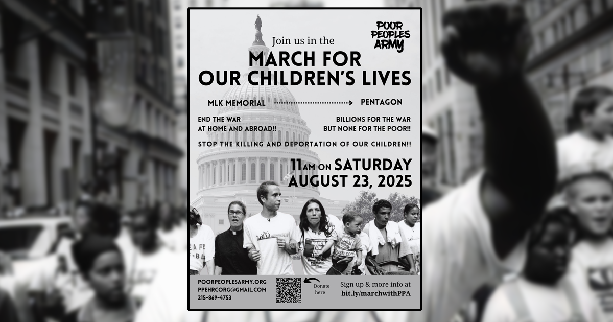 Join the Poor People's Army August 23rd at 11 am at MLK Monument in Washington DC (1964 Independence Ave SW, Washington, DC). BRING YOUR CHILDREN AND GRANDCHILDREN! Mothers, grandmothers, fathers and our children will lift of the contradictions of spending billions of dollars on war, death and destruction and human rights violations when families and children in the U.S. also suffer from malnutrition, homelessness, poverty, homicide, suicide and drug addiction. Ghandi once said, poverty is the worst form of violence.
