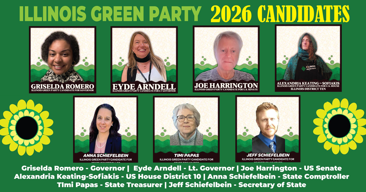 The Illinois Green Party ballot access drive kicks off tomorrow and Thursday with opportunities to meet the candidates live and in person! Come see for yourself why Greens are poised to shake up the system!