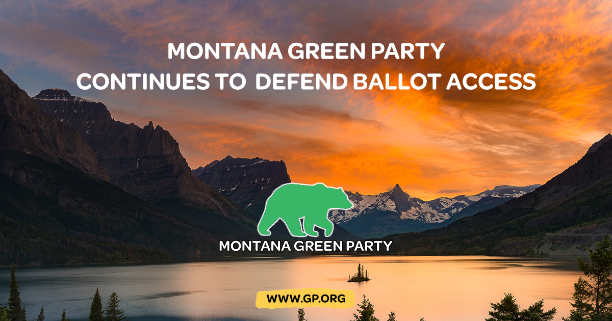The MTGP Coordinator Danielle Breck stated that “The Montana Green Party has repeatedly shown, through our various petitioning efforts, that we do, in fact, have the “modicum of voter support” the law requires and that our candidates are not “frivolous,” but rather provide an important alternative to pre-selected, unresponsive, corporate controlled candidates offered by the two-party oligarchy. The state statute on which the plaintiff’s case is based is itself unconstitutional, and it is for this reason we believe this matter should be heard in federal court.”