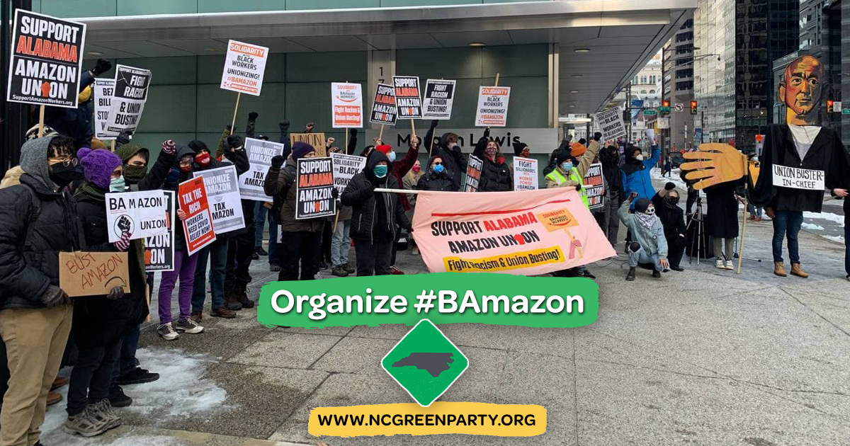 PITTSBORO, NC – Over the past several weeks, the North Carolina Green Party has been active in supporting the Bessemer, Alabama Amazon warehouse worker vote to organize under the representation of the Retail, Wholesale Department Store Workers Union (RWDSU). This potentially historic campaign, nicknamed “Organize #BAmazon”, began as a bold effort by predominantly black workers who first formed the “Bamazon Workers Union”; it is the first Amazon unionization vote in over six years and could become Amazon’s first organized facility in the United States. A “YES” vote victory would have a tremendous symbolic impact and could change momentum in the largely unorganized US South by showing everyday people, nationally and internationally, what truly is possible when workers unite.