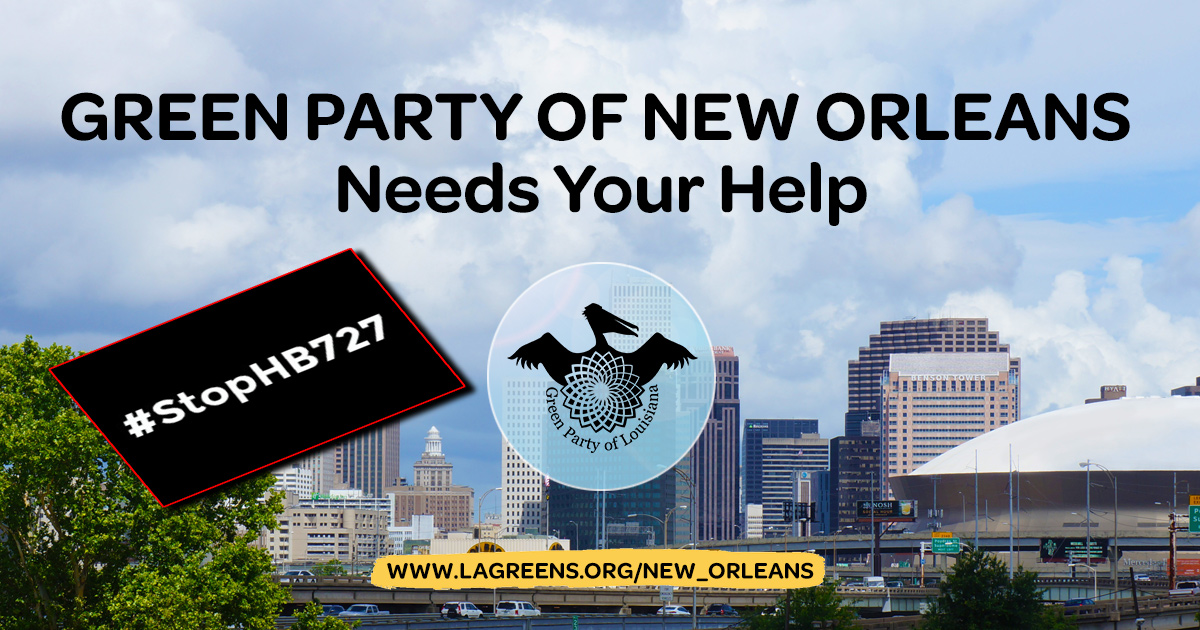 The New Orleans Chapter of the Green Party is asking for your support. We've joined a coalition of groups opposing HB 727. We urge you to join the resistance. Our allies at 350neworleans.org tell you how in this message: