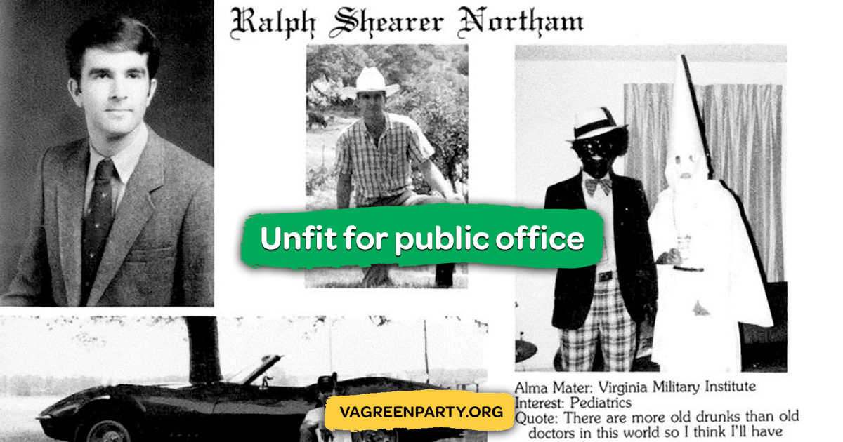On Friday, February 1, the Green Party of Virginia became aware of a photograph from Virginia Governor Ralph Northam's 1984 yearbook from the Eastern Virginia Medical School (EVMS). The photo showed one person dressed in the robes of the Klu Klux Klan and a second dressed in blackface. In a press conference that evening, the governor acknowledged he was one of the people in the photo and apologized.