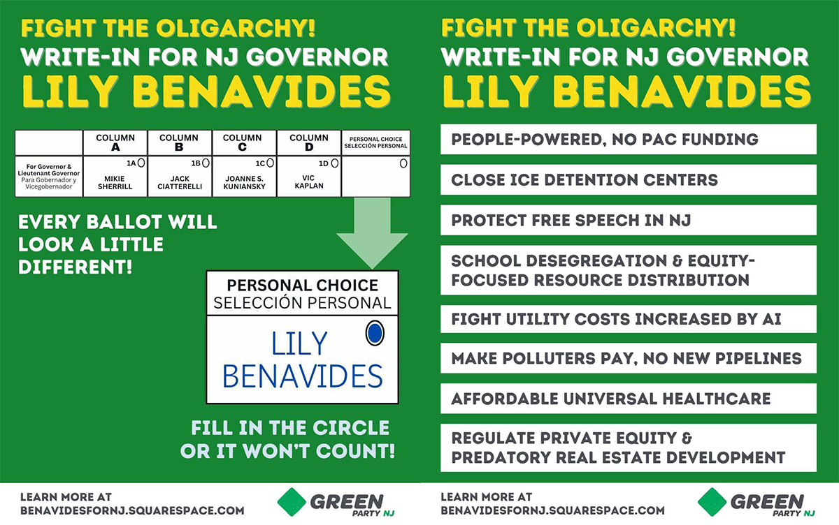 With campaign manager, Madelyn Hoffman, Lily has a full social media presence and has hosted debate rebuttals and live streams. She has a robust platform, website and an amazing campaign team. Lily has received endorsements from CeaseFire Now NJ, Fight Back Better, Dr. Irfan Khawaja and Rich Siegel. We hope you will support Lily's write-in campaign and make her your "personal choice" for governor. Each ballot is slightly different but you will need to type in her name fully for the vote to count: LILY BENAVIDES. You can follow her here and learn more about the campaign.