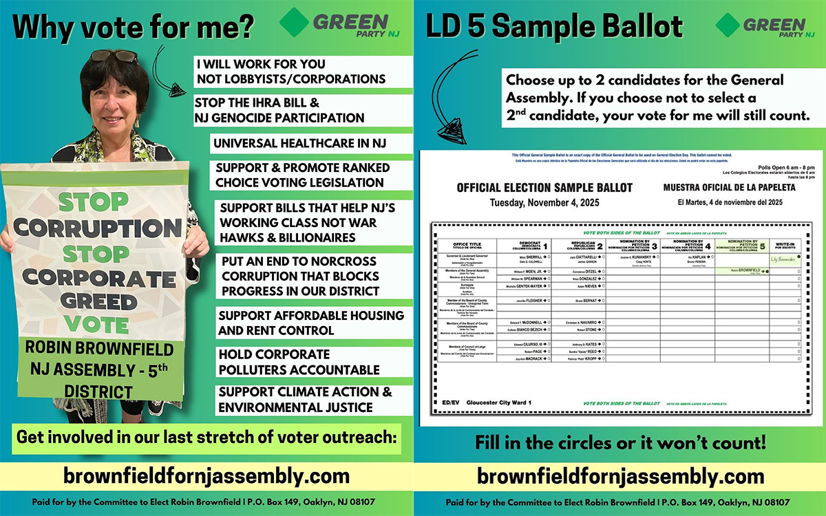 Robin Brownfield on the heels of her Congressional run last year has stepped up to represent the working-class for State Assembly. Robin is running to ensure a new voice would be on the ballot to represent the issues we need addressed in Trenton. This year has proven that both major parties are negligent in maintaining free speech and are capitulating to the donor class when we need an advocate for the people.