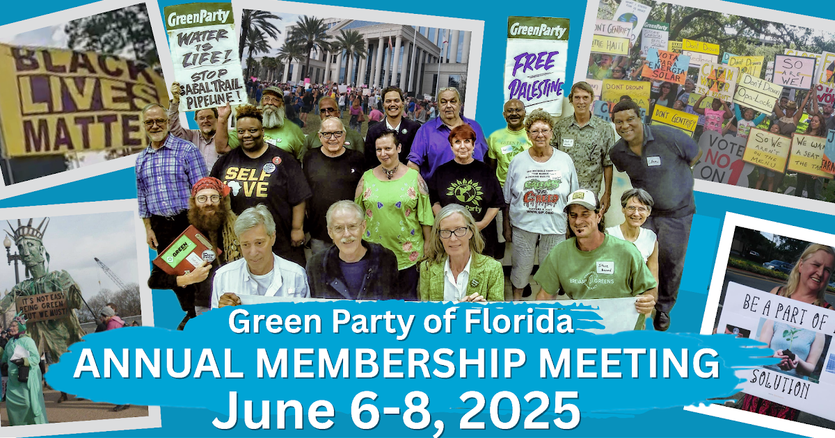 We the People must stand up and fight against the destructive authoritarian onslaught waged by the billionaire class against the People, Planet, and Peace. The Green Party has a vital role to play in the resistance. The Green Party of Florida (GPFL) calls upon our Florida members and friends to join in building the party into an effective instrument in the struggle and together help devise a plan of action for the near future.