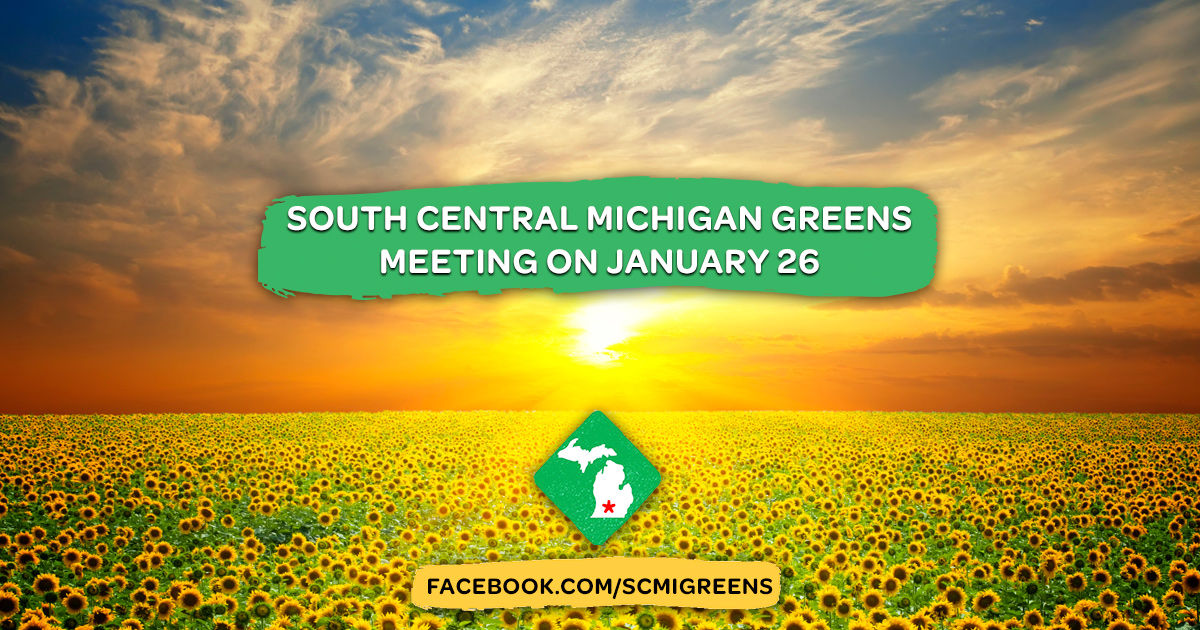 The South Central Michigan Greens local's January monthly meeting has been postponed to 1:00 β 3:00 pm on Saturday, January 26 at Biggby's Coffee, 1125 East Michigan Avenue in Emmett Township east of Battle Creek.