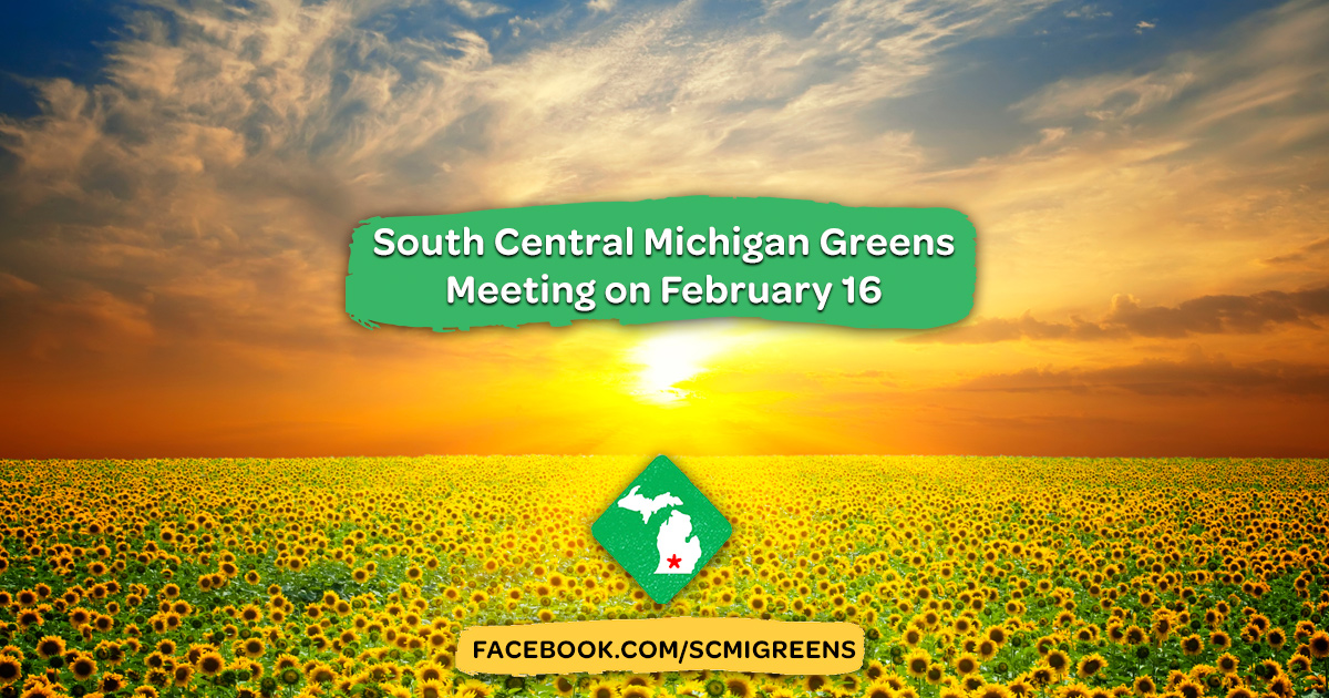 The South Central Michigan Greens local will hold its monthly meeting 1:00 – 3:00 pm on Saturday, February 16 at the downtown Jackson Coffee Company (201 South Mechanic Street in Jackson).