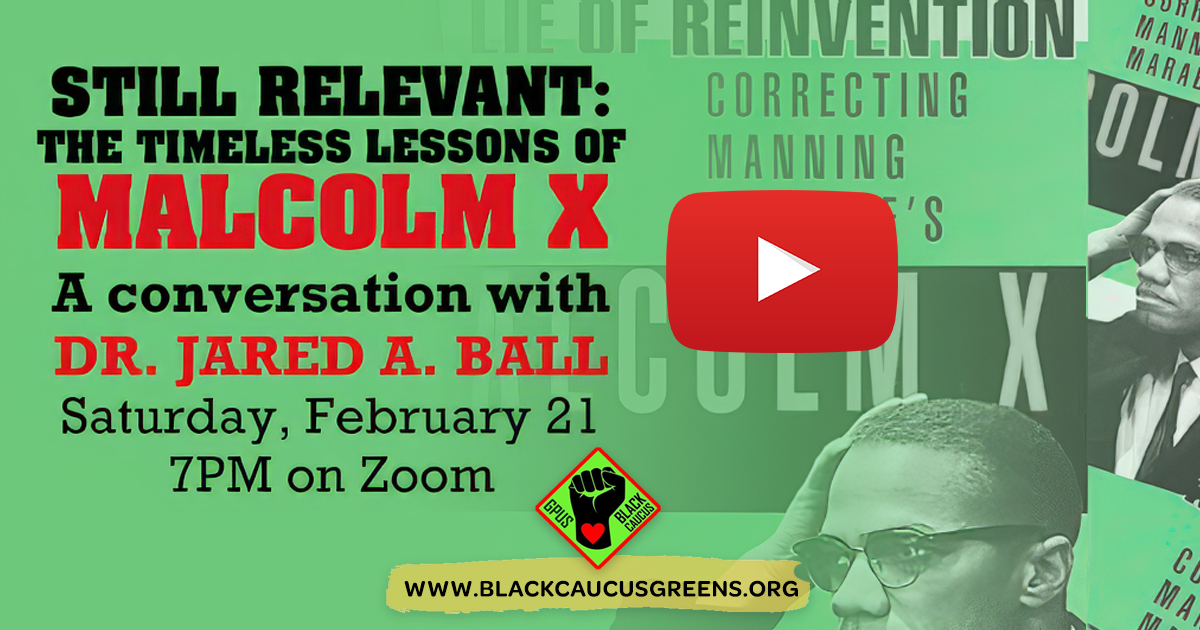 In commemoration of the anniversary of the Assassination of Malcolm X, the National Black Caucus of the Green Party of the United States held a special webinar on Saturday, February 21: Still Relevant: The Timeless Lessons of Malcolm X, a conversation with Dr. Jared A. Ball
