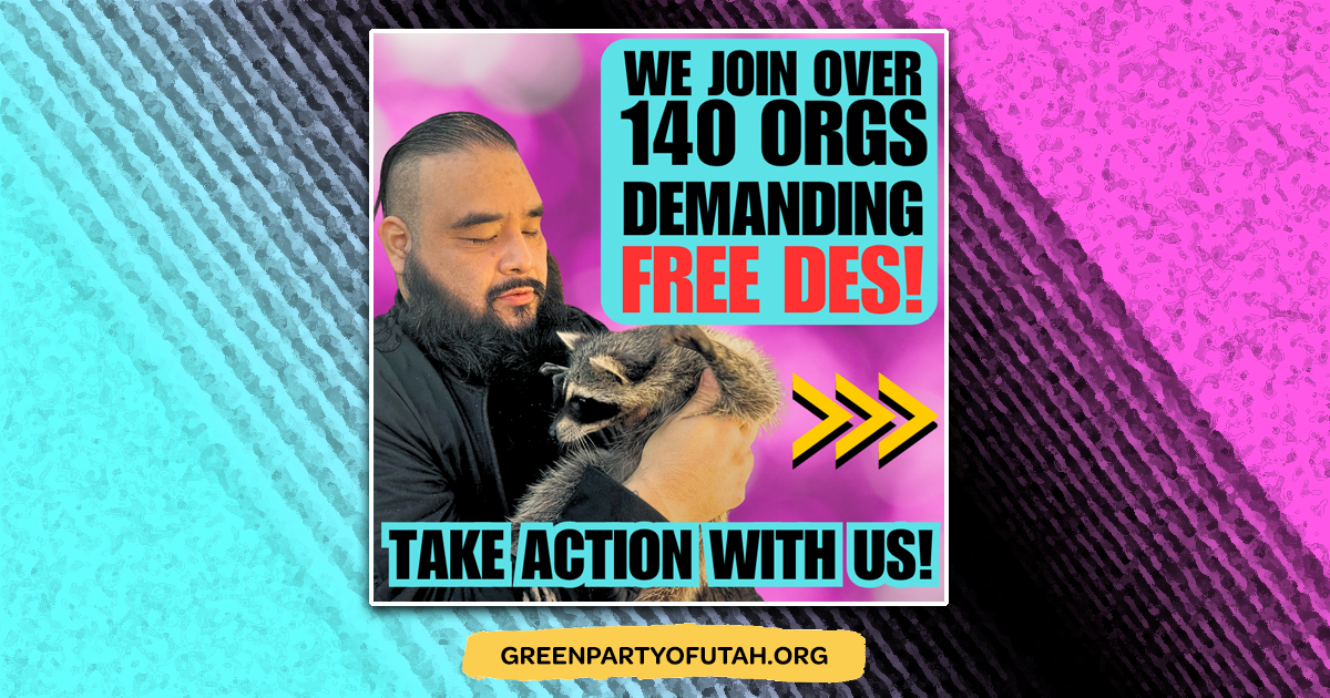 The Green Party of Utah (GPUT) has signed on to the “Free Des” Letter, calling for his release from prison. Since July 6, 2025, Daniel “Des” Sanchez Estrada has been held in federal prison for distributing materials that opposed the Trump administration’s policies.